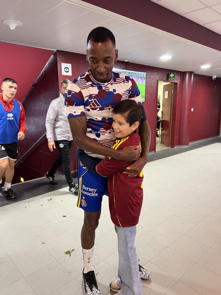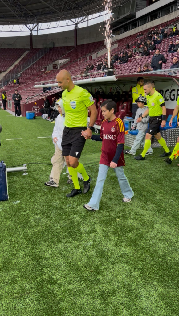 Grosse émotion pour sa famille lorsqu’elle entre sur le terrain avec l’arbitre et message fort pour les copains hospitalisés qui, très bientôt, pourront également venir au stade.